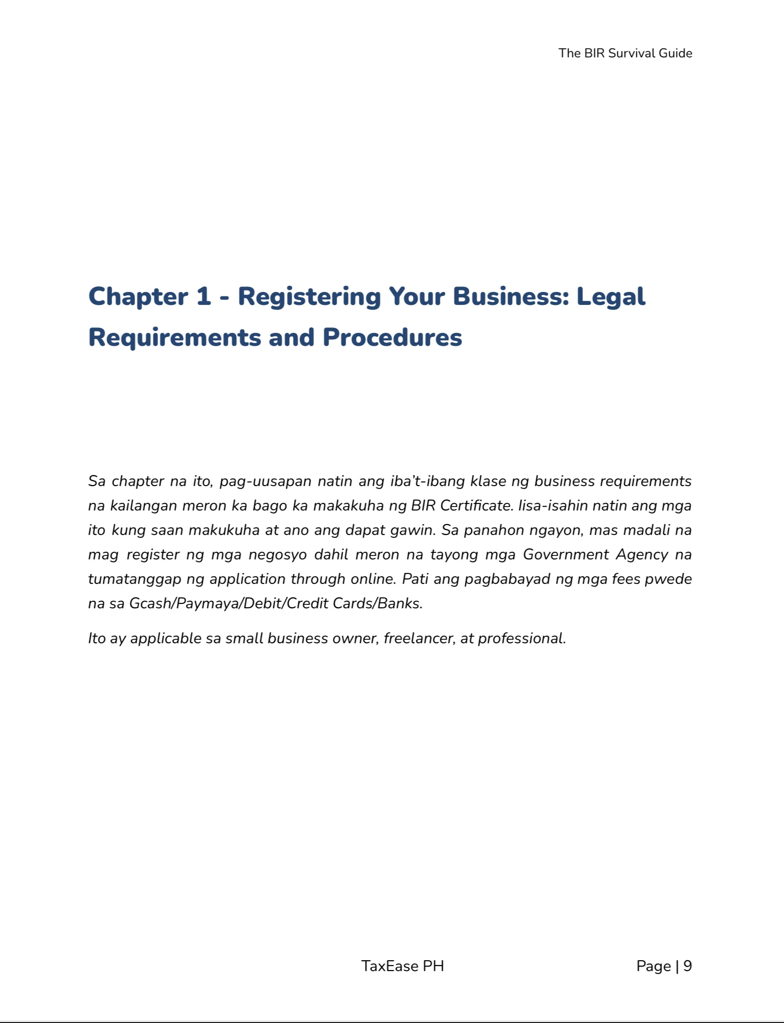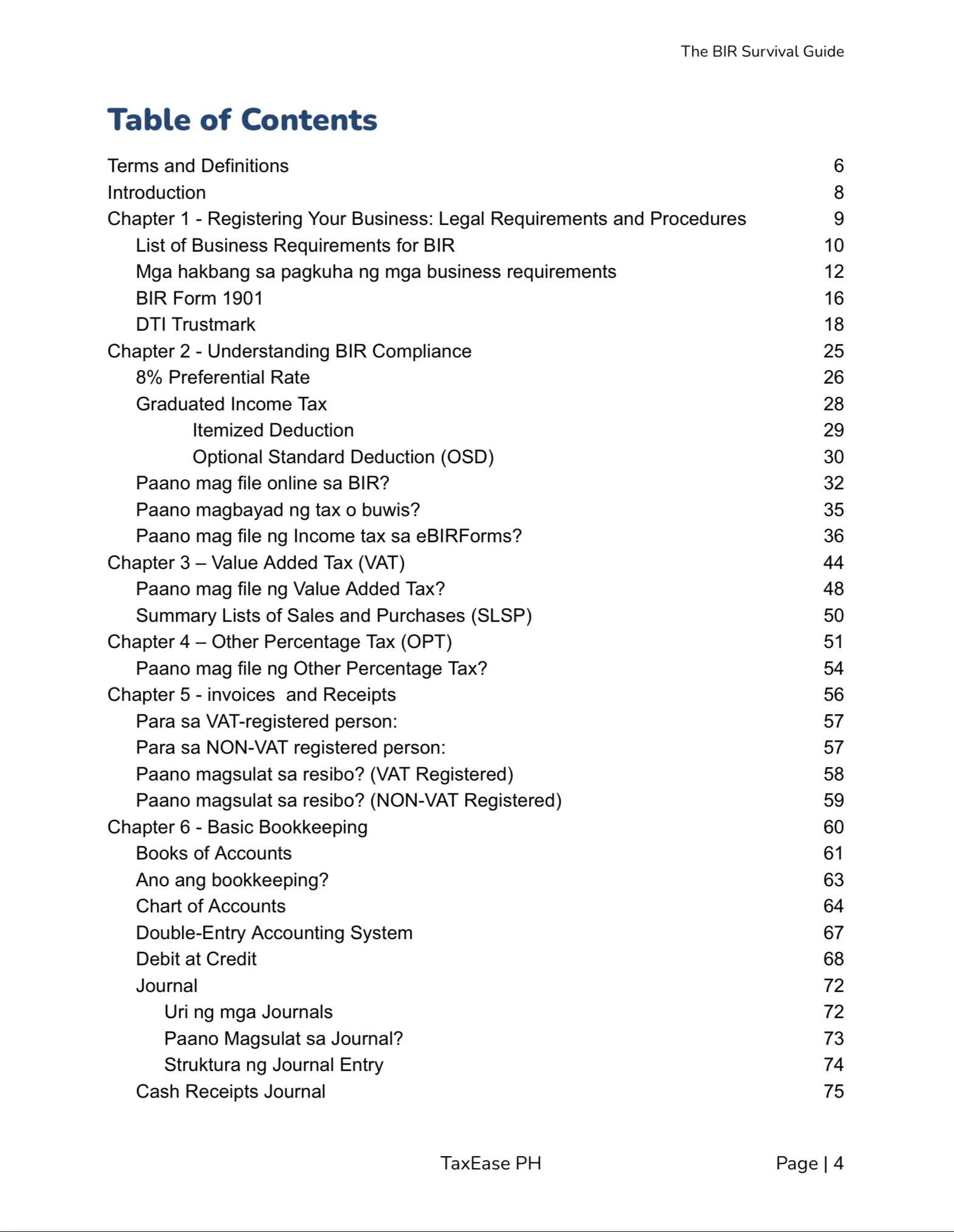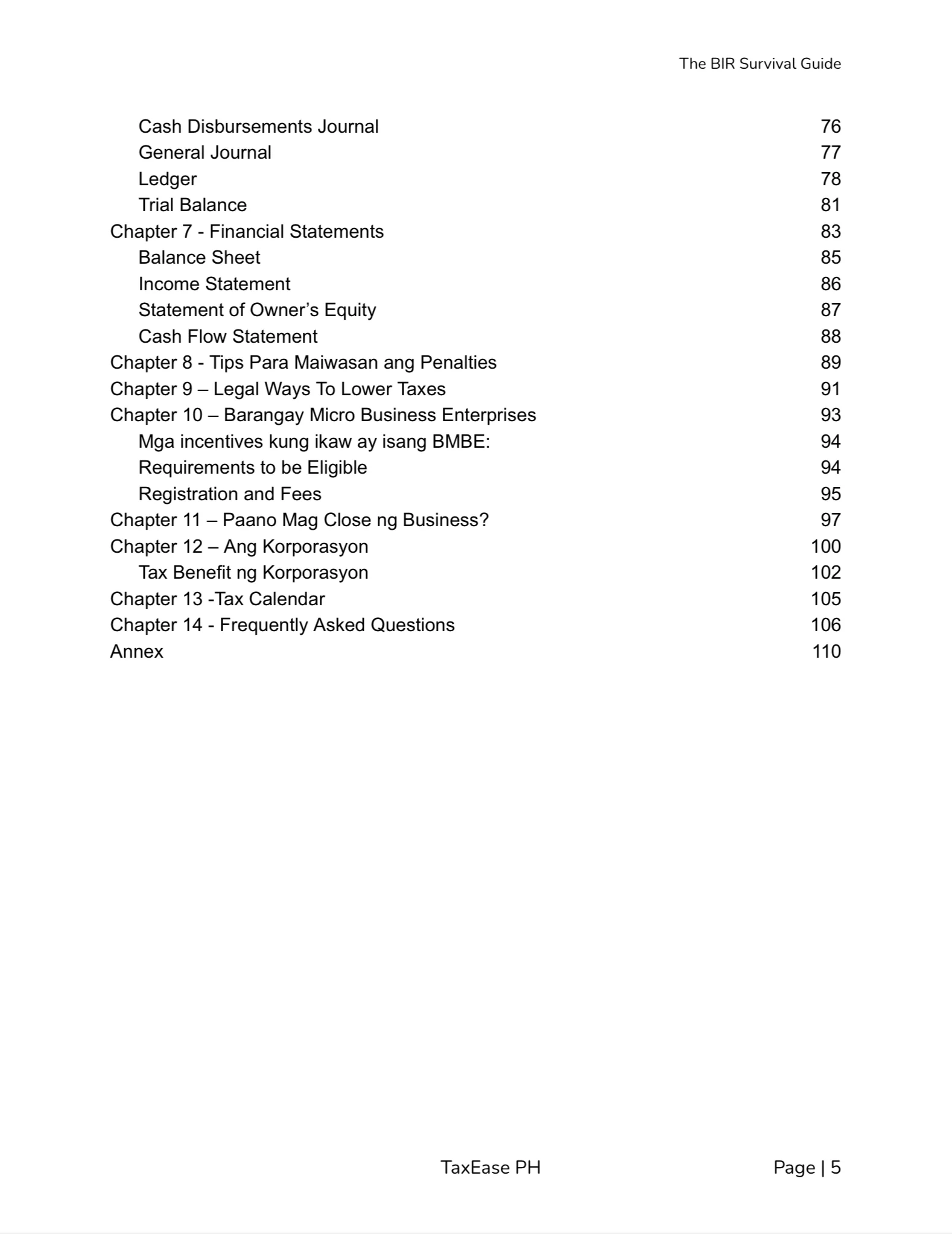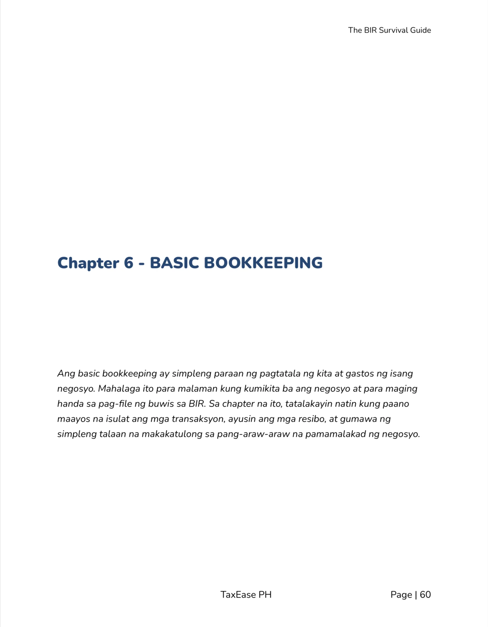 Ito ang pinaka kumpletong guide sa BIR! 14 chapters covering lahat ng kailangan ninyo: registration, tax compliance, bookkeeping, VAT, OPT, financial statements, penalties, legal ways to lower taxes, BMBE, corporation setup, at marami pang iba.